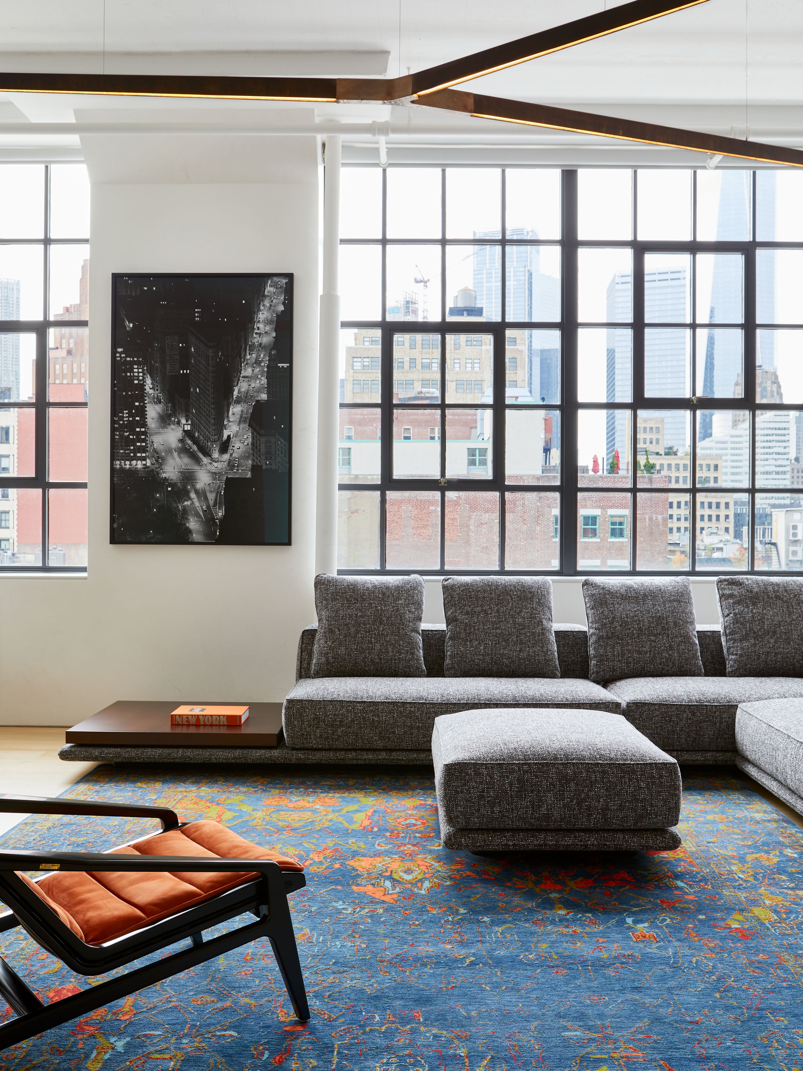 This is a contemporary version of an antique Oushak carpet colored in a bold modern way. Delicately woven in 200 knot wool and silk to create fine detail with nods to the elements.