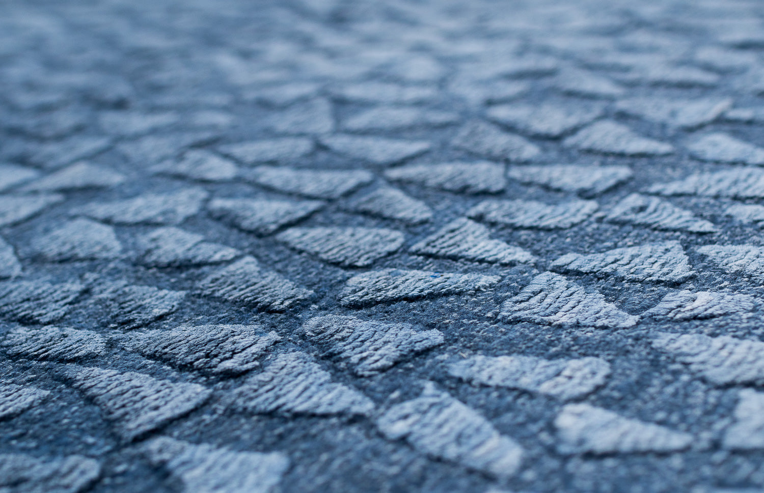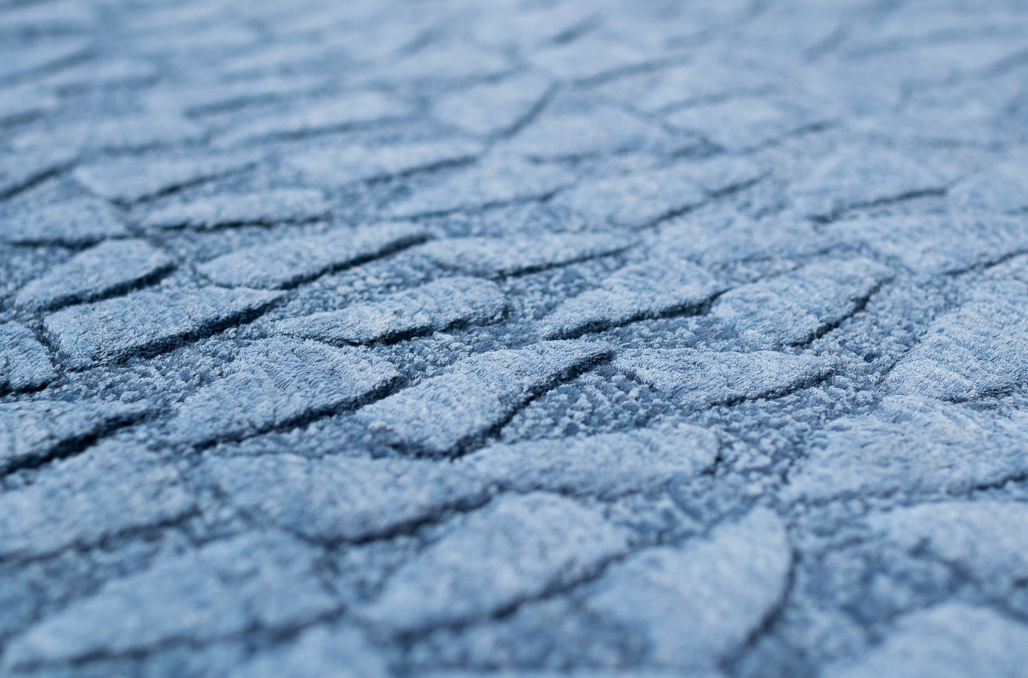 An irregular, non-repeating geometric pattern of triangles that dance across the field. The pattern has endless possibilities, as we have reimagined many versions. This one in particular has beautiful High/Low texture of silk design and silk and wool ground.