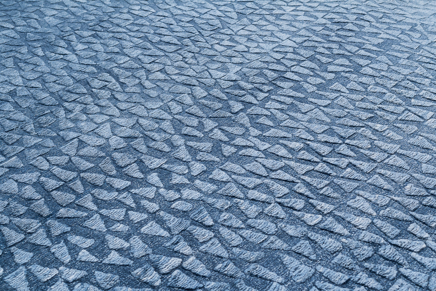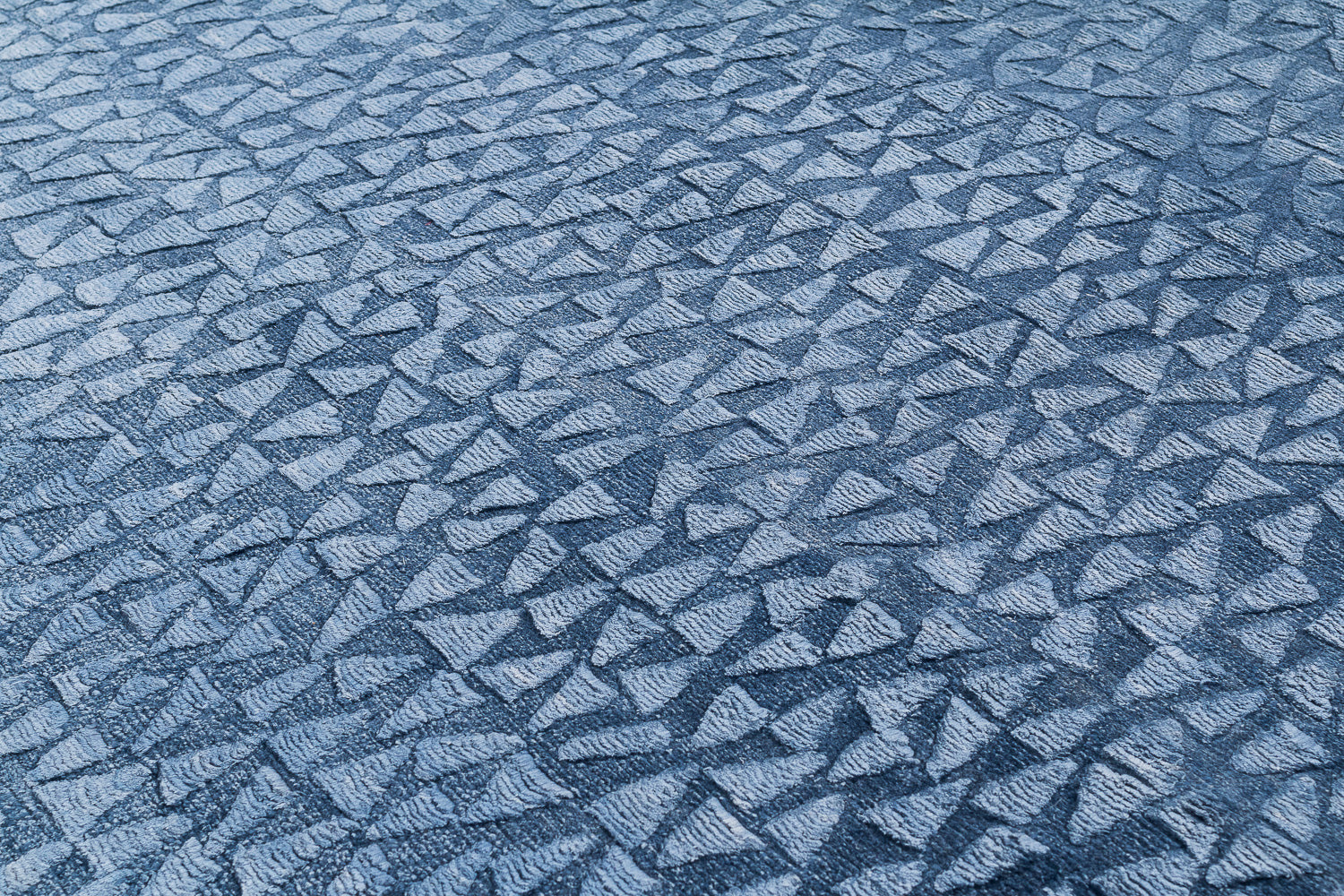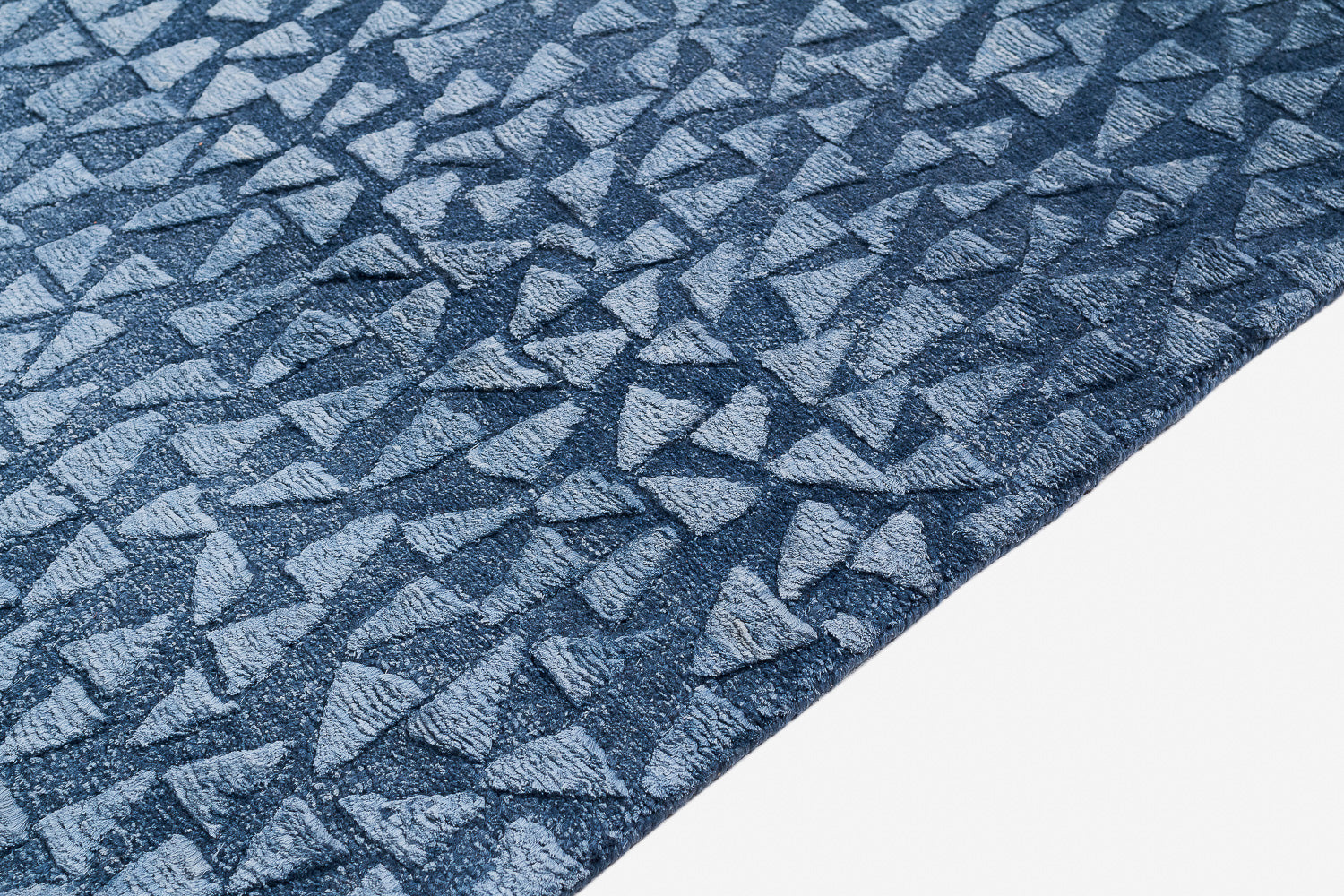 An irregular, non-repeating geometric pattern of triangles that dance across the field in high piles of silk over a wool and silk ground. The pattern has endless possibilities, as we have reimagined many versions.