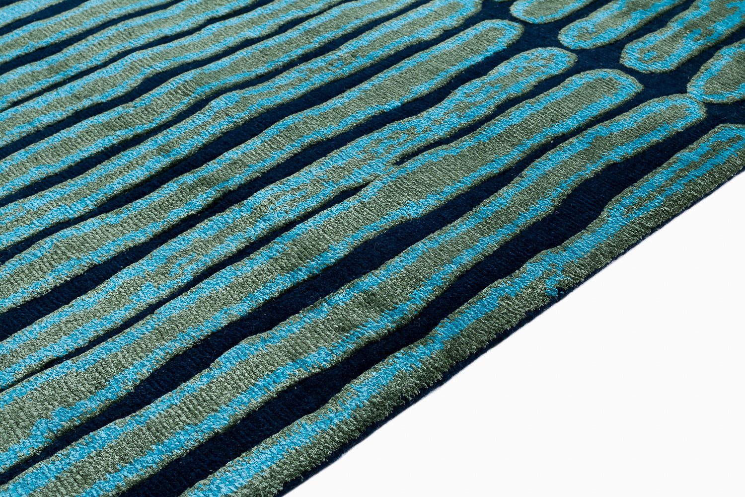 A newer abstract design by Joseph Carini, Divali is a 100 knot carpet, hand knotted with silk and wool. It has a subtle texture- the wool background is 5mm high and the silk detailing is 6mm. The colors are vibrant and hold tremendous depth, it really must be seen in person to fully appreciate.