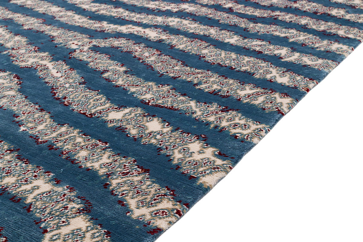 Fishkin features a soothing interplay of wavy stripes and soft, frothy bands, evoking the gentle ebb of waves along the shore. Its organic pattern draws inspiration from the subtle camouflage of tropical creatures, creating a serene yet dynamic visual. The rich silk adds a luminous, iridescent quality, enhancing the design's depth and sophistication.