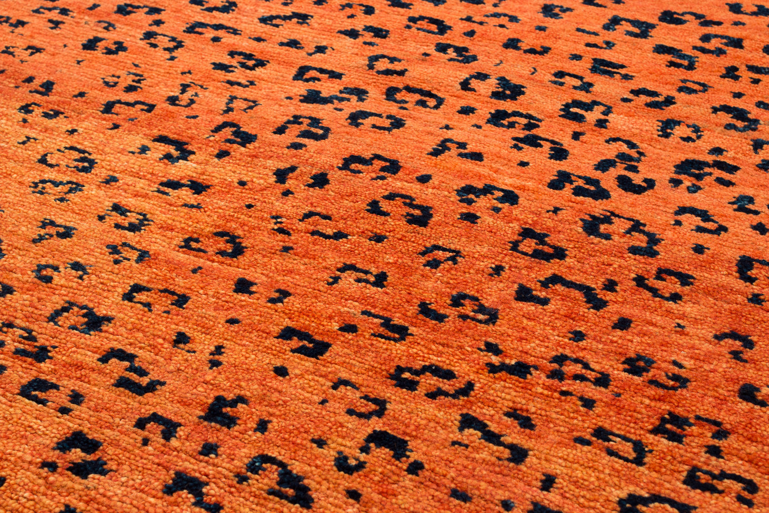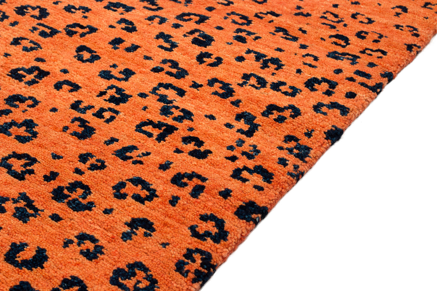 A strong orange field contrasts against the deep indigo leopard dots in our Leopard print design. Woven in wool, Joseph Carini was inspired by the agile predator.