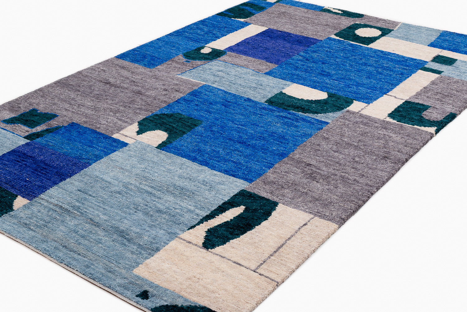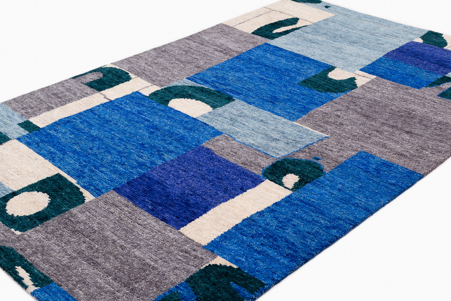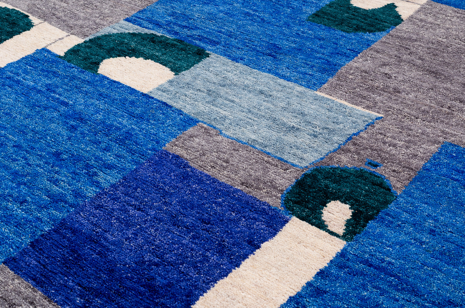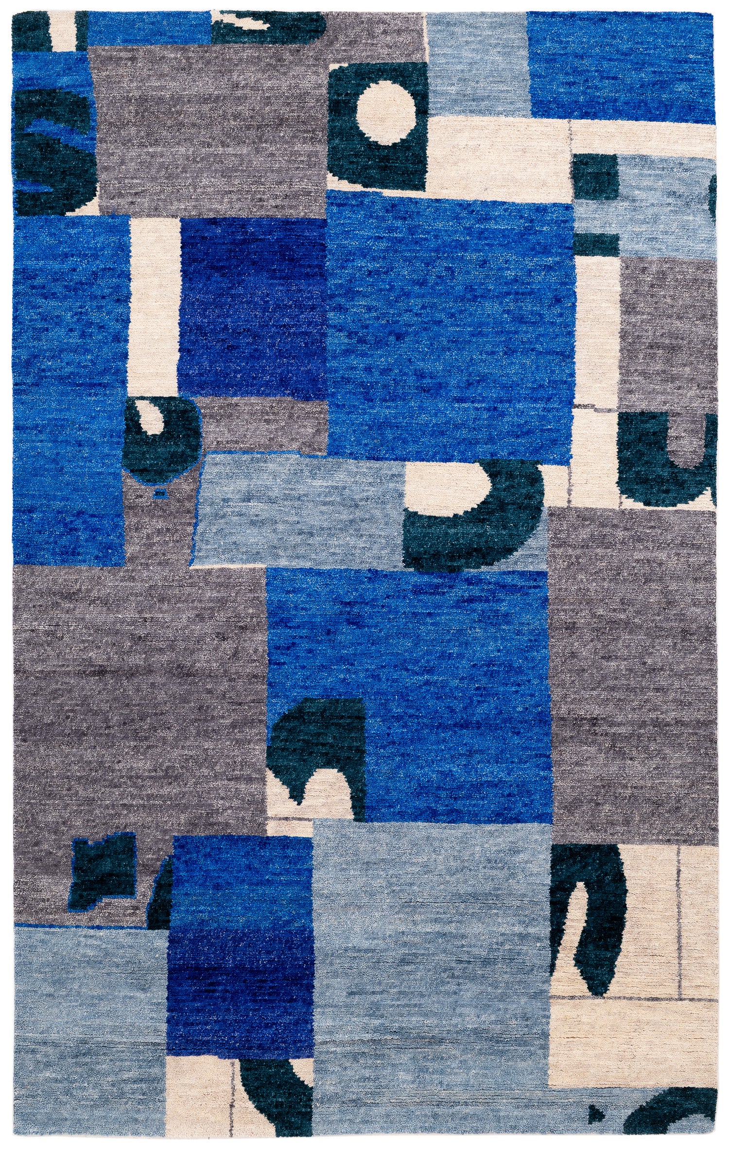 A collage of geometrics shapes, and bold variations of indigo dyed into wool. This rich, textured weave is slightly thicker and more robust than our standard 100-knot designs, offering unique depth and character.