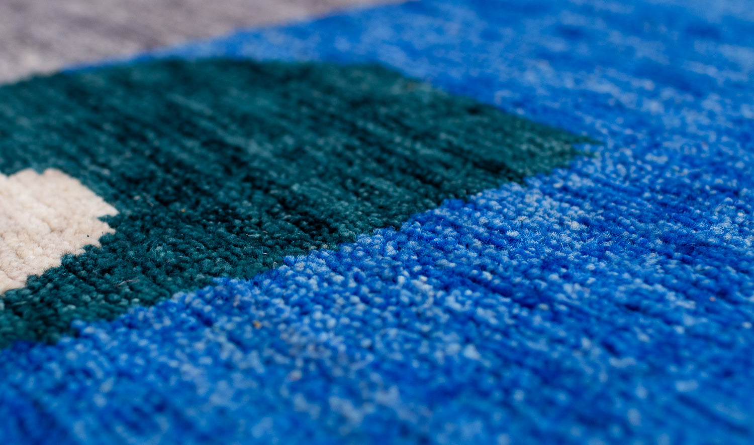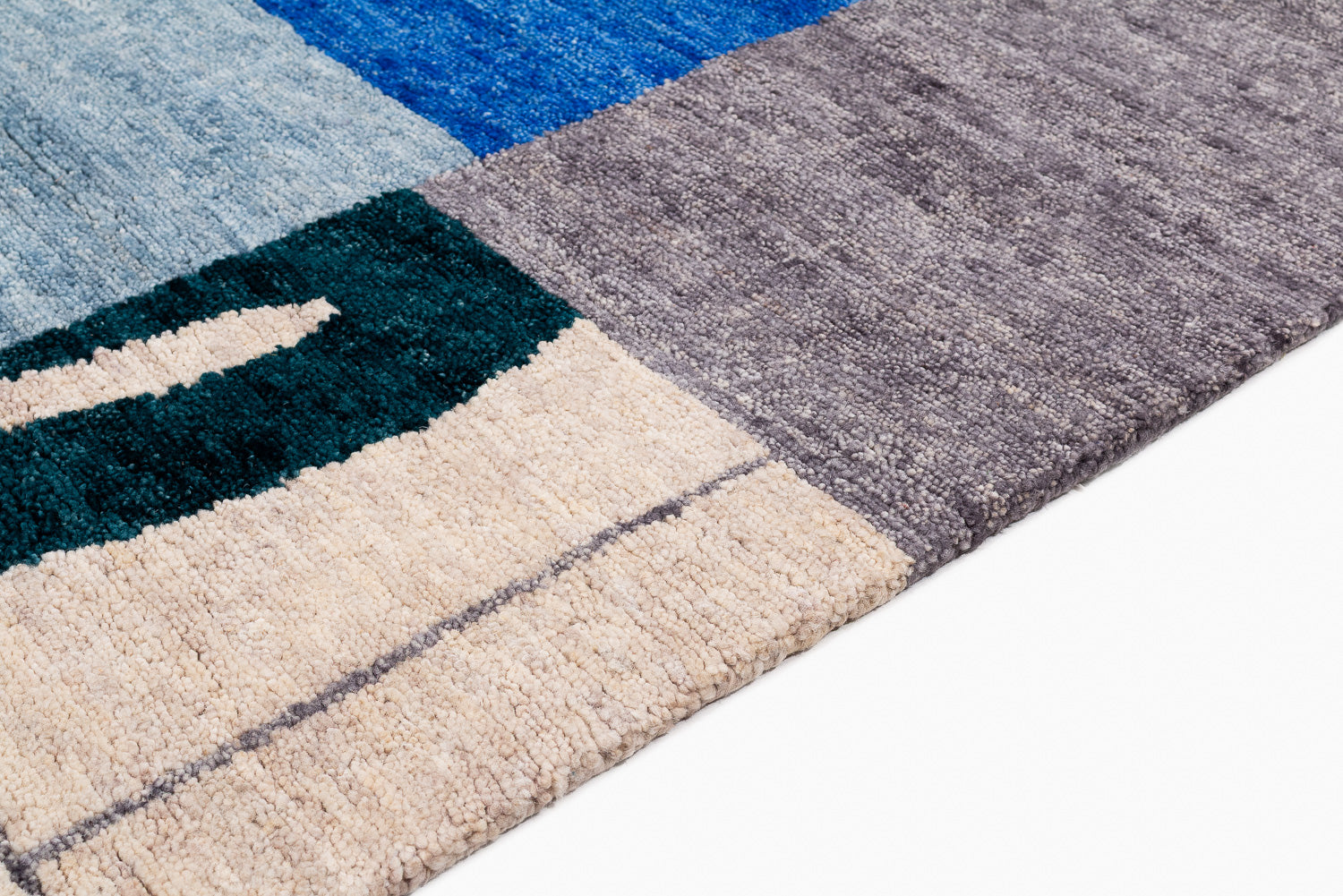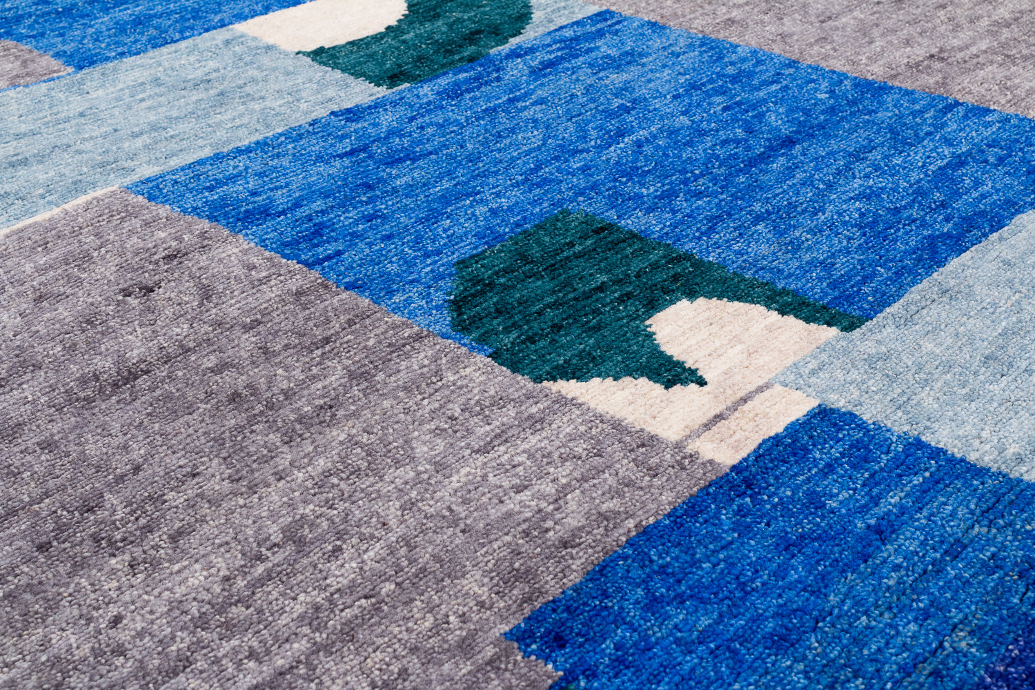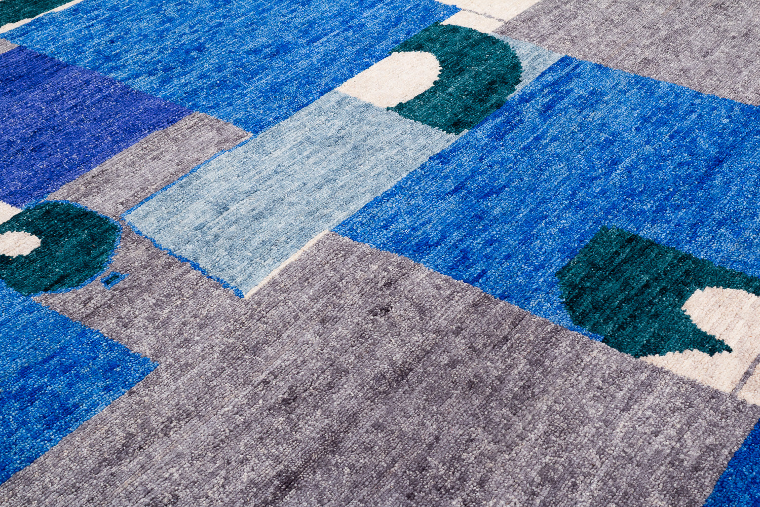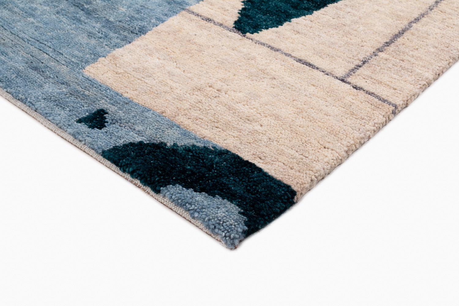 A collage of geometrics shapes, and bold variations of indigo dyed into wool. This rich, textured weave is slightly thicker and more robust than our standard 100-knot designs, offering unique depth and character.