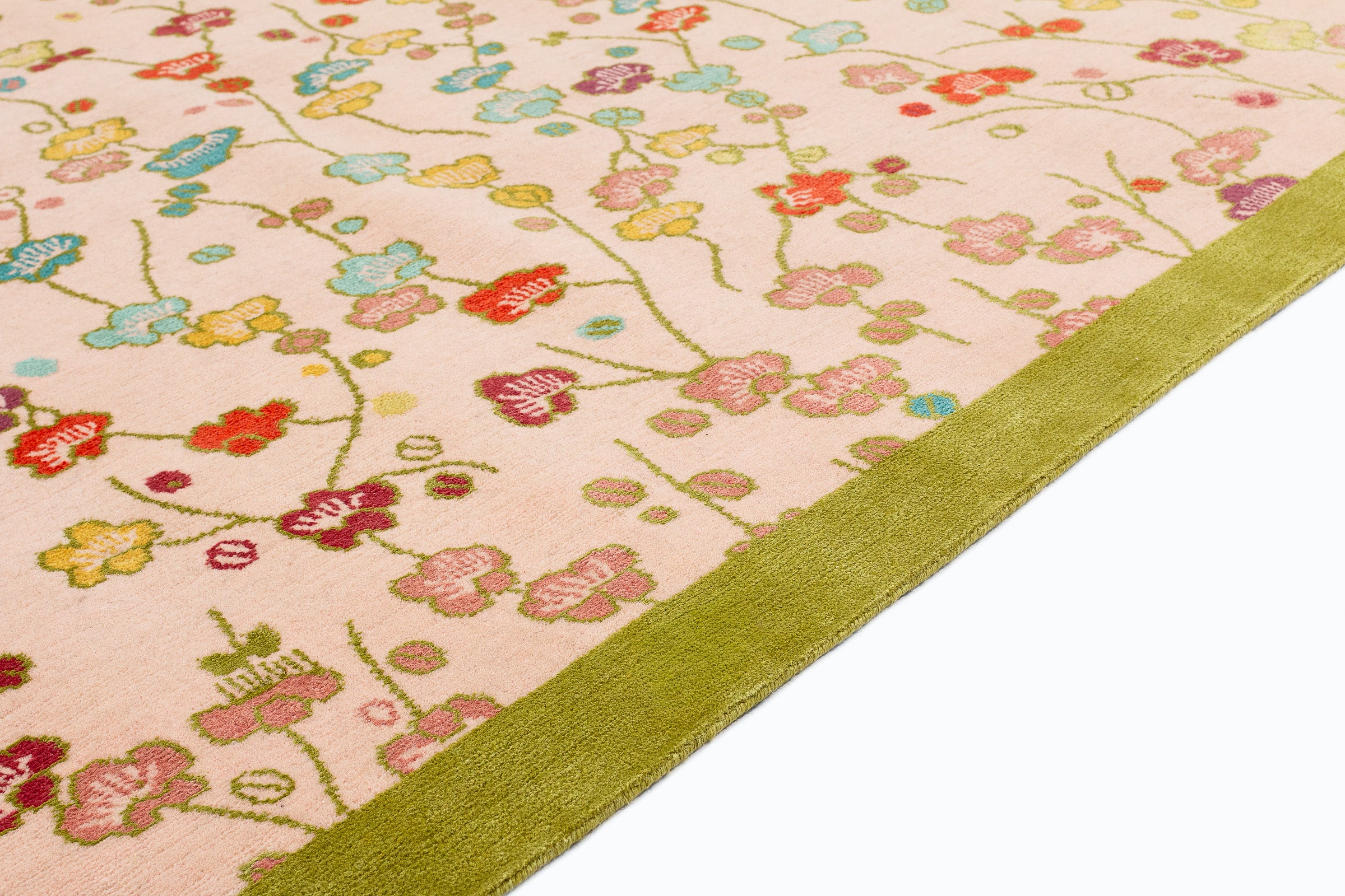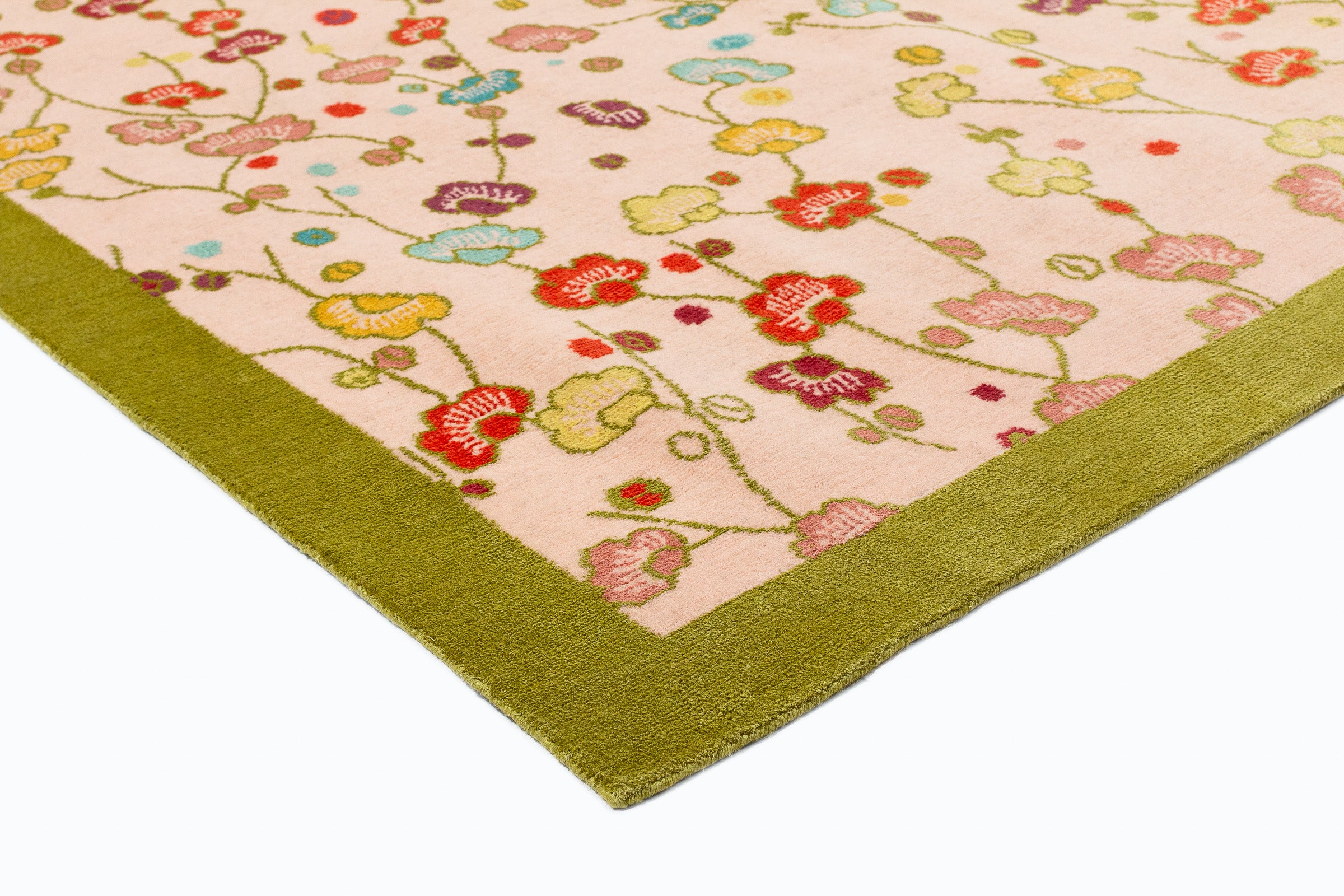 Delicate multicolored floral vines spread over a solid backdrop creating a spirit of rebirth and rejuvenation in the Spring Blossom design. This carpet is woven in 125 knot which allows for refined details of blooming buds, cultivating an expansive and lively motion.