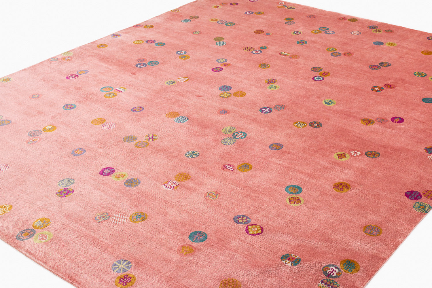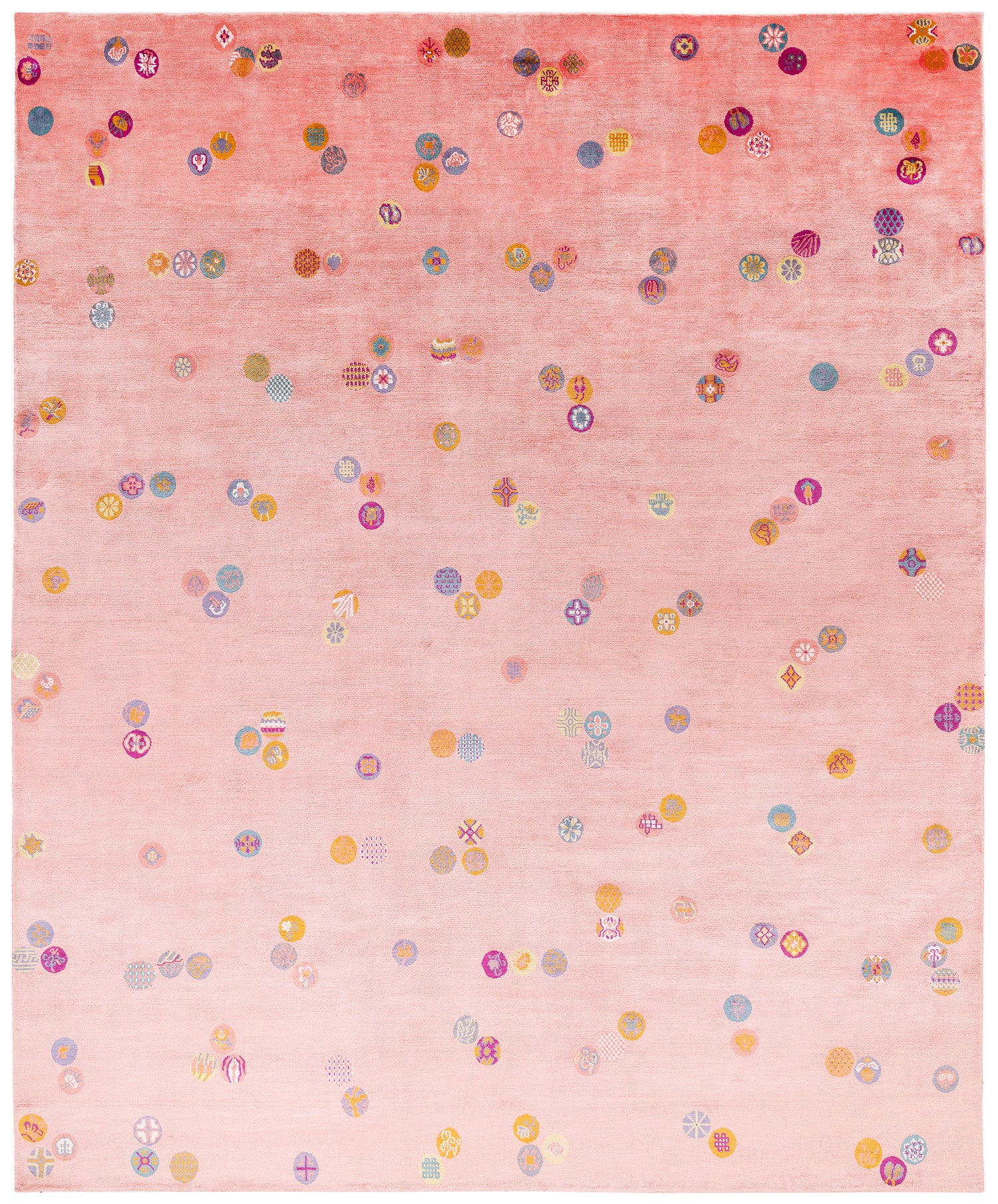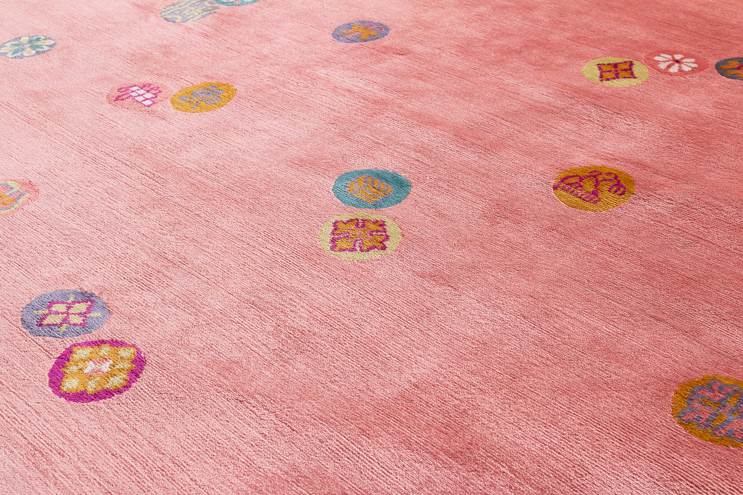 This luxurious silk rug features a stunning silver base, delicately adorned with Chinese-inspired emblems in a variety of colors. The playful interplay of these designs adds a touch of whimsy, while the rich metallic accents elevate the piece with timeless sophistication.