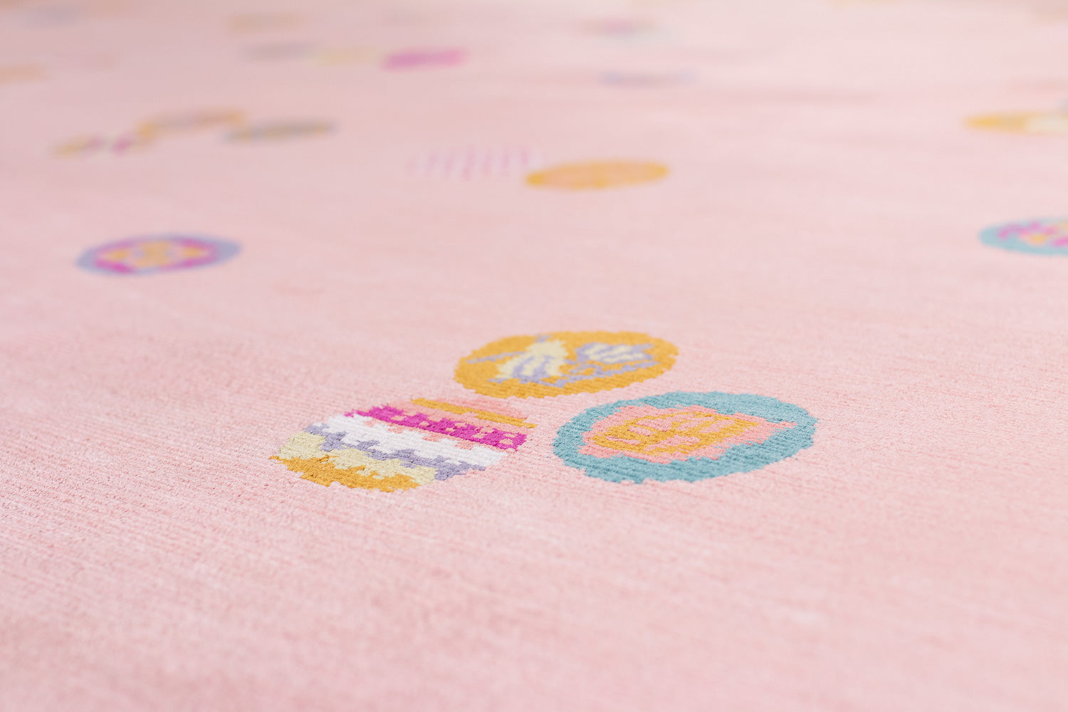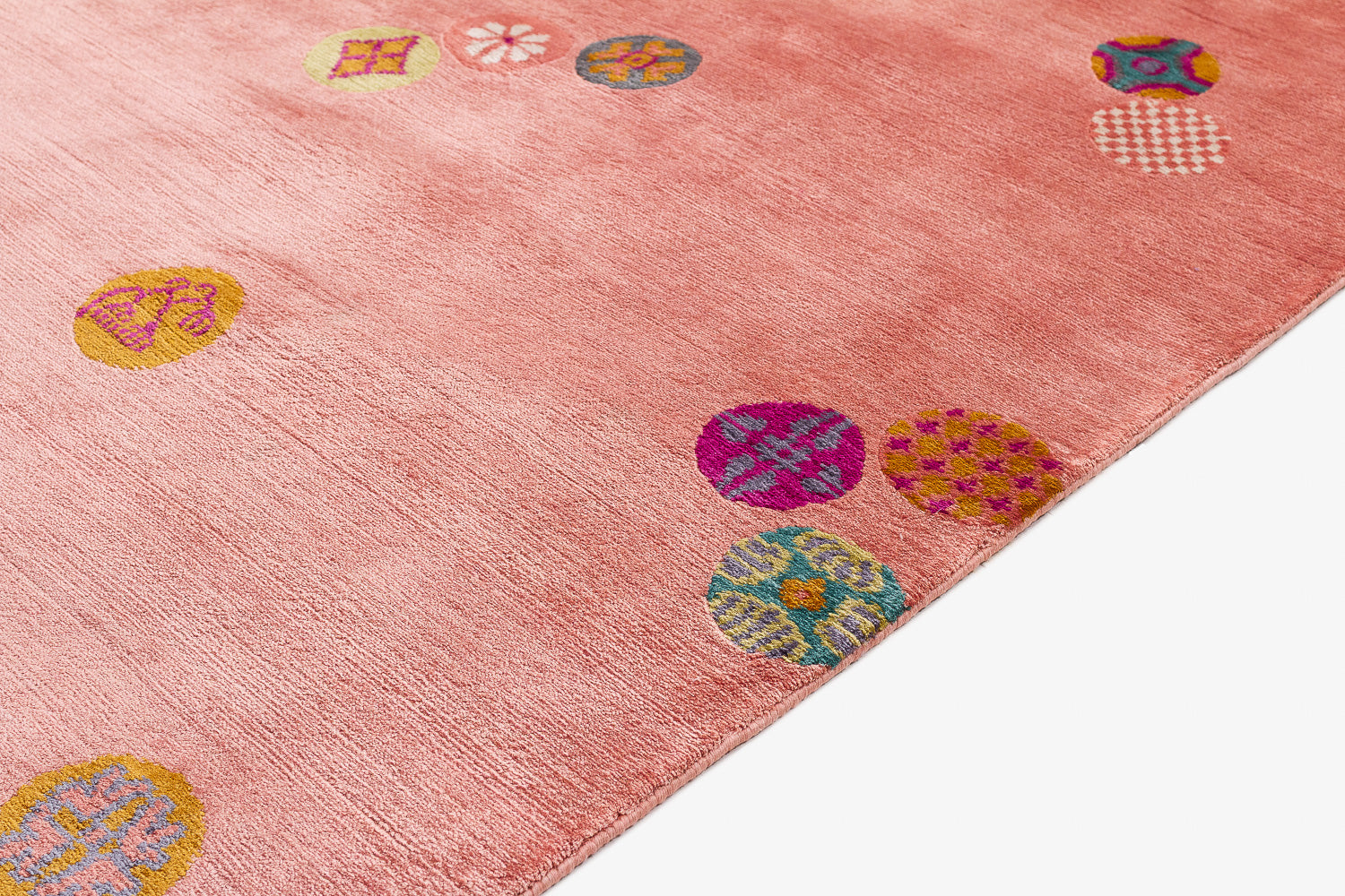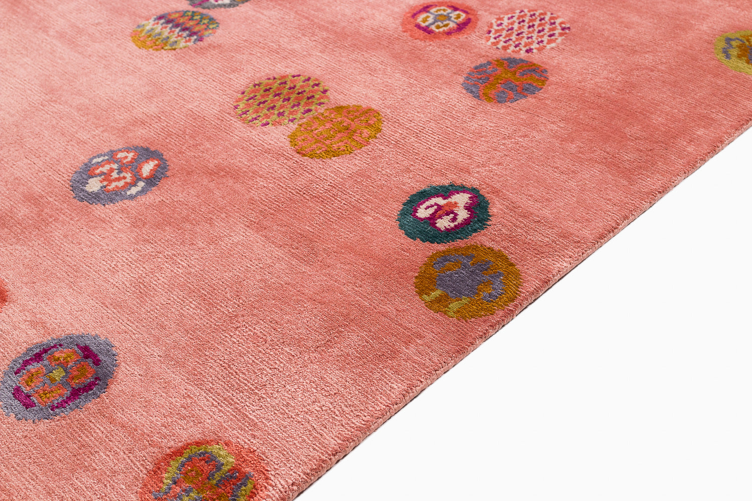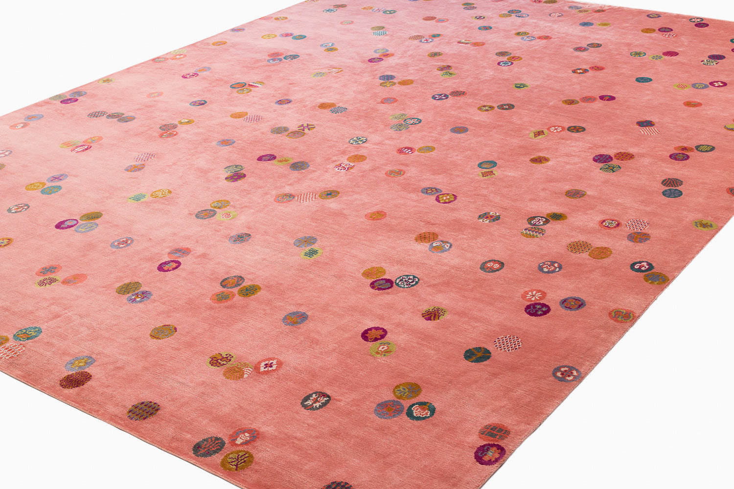 This luxurious silk rug features a stunning silver base, delicately adorned with Chinese-inspired emblems in a variety of colors. The playful interplay of these designs adds a touch of whimsy, while the rich metallic accents elevate the piece with timeless sophistication.