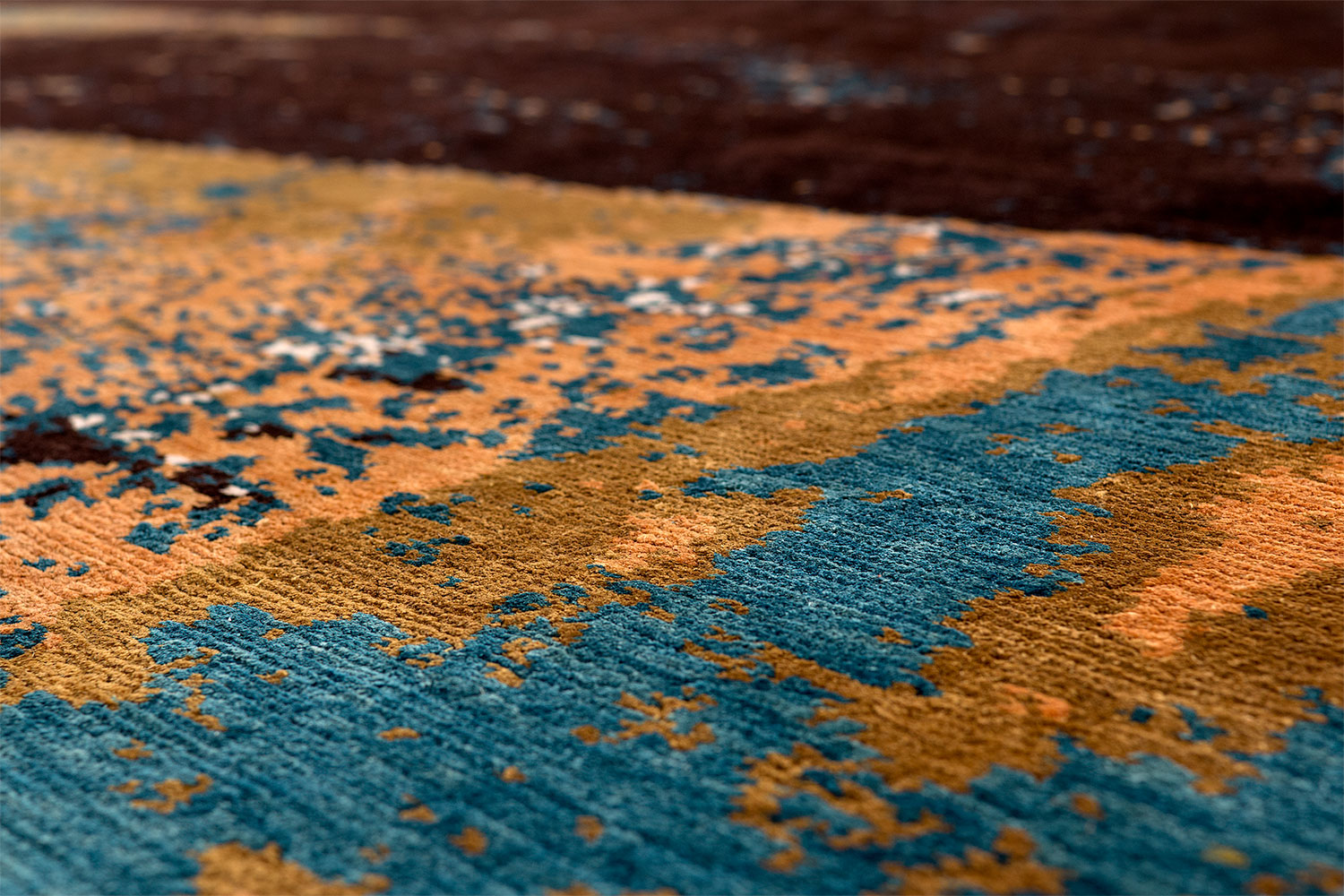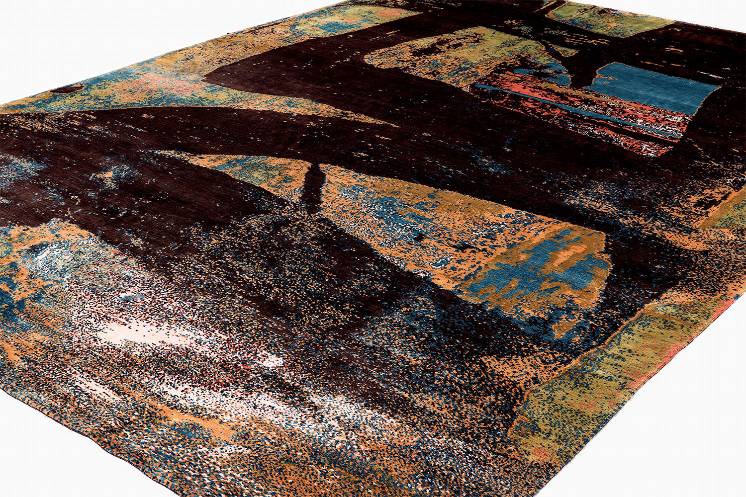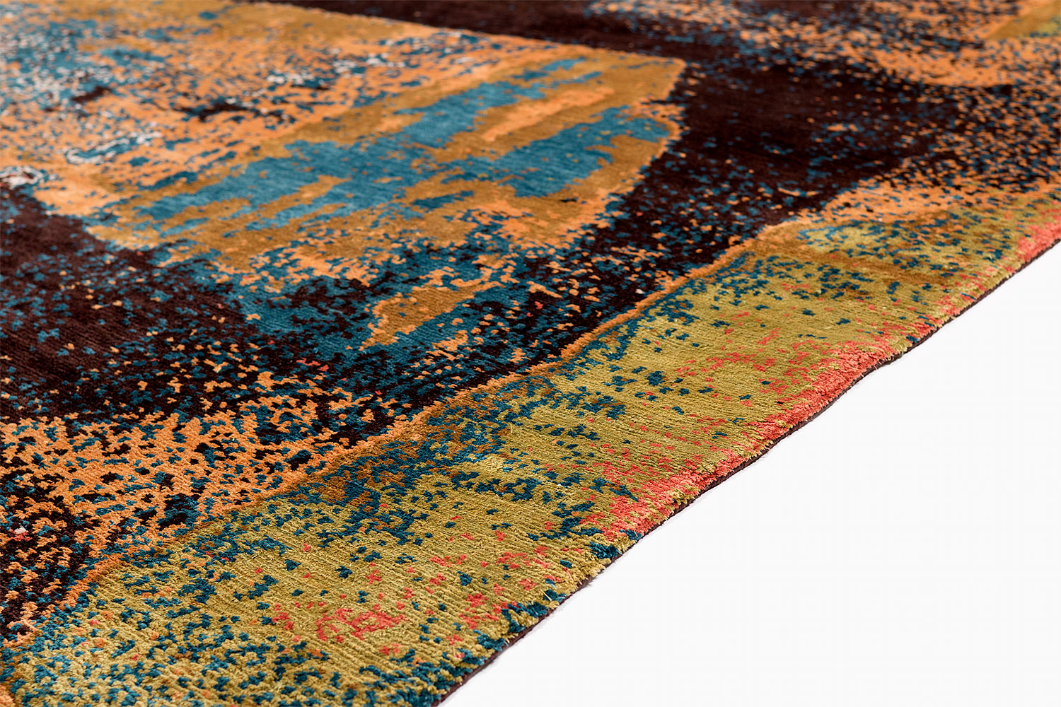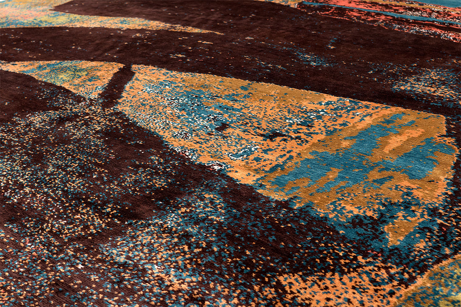 A contemporary, abstract rug created to make a painterly, dynamic pattern by using some of the best state of the art natural dyes. Handwoven in 100 knotted in 100% silk creates an elegant and bold statement carpet designed by Joseph Carini and Karl Klingbiel.